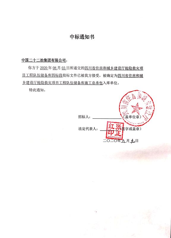 2020年8月9日,中國二十二冶集團(tuán)有限公司成都分公司收到四川省住房和城鄉(xiāng)建設(shè)廳“四川省住房和城鄉(xiāng)建設(shè)廳搶險(xiǎn)救災(zāi)項(xiàng)目工程隊(duì)伍儲(chǔ)備庫”項(xiàng)目中標(biāo)通知書,這標(biāo)志著成都公司正式進(jìn)入四川省住房和城鄉(xiāng)建設(shè)廳搶險(xiǎn)救災(zāi)項(xiàng)目工程隊(duì)伍儲(chǔ)備庫(施工總承包單位)。