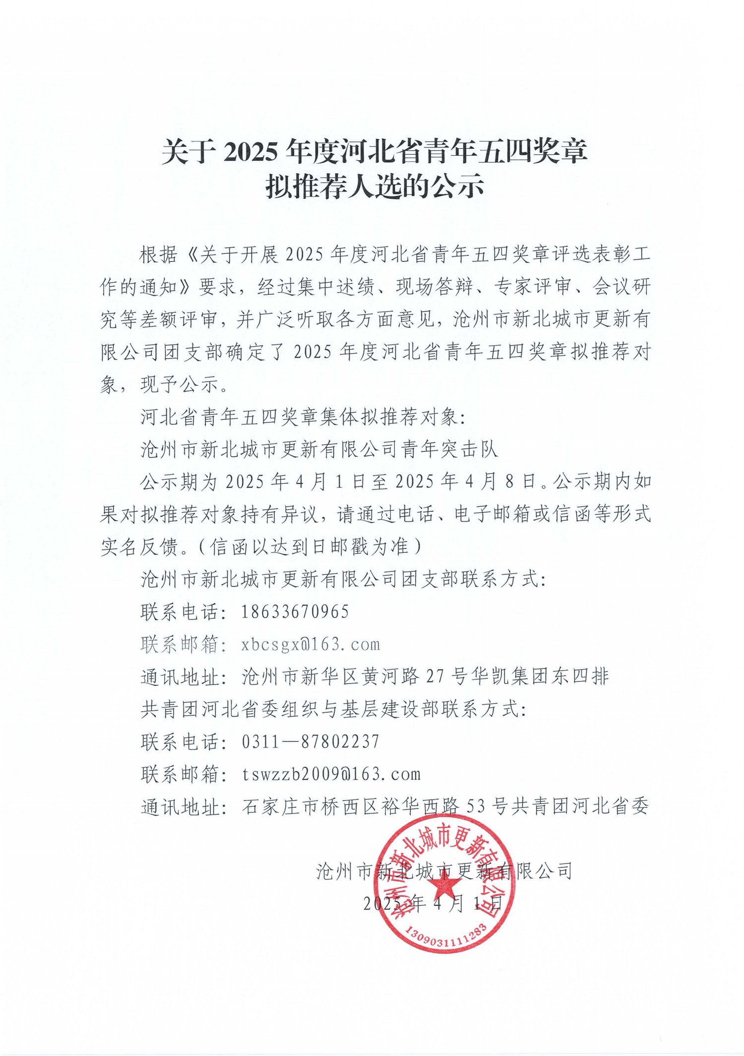 根據(jù)《關(guān)于開展2025年度河北省青年五四獎(jiǎng)?wù)略u(píng)選表彰工作的通知》要求,經(jīng)過集中述績(jī)、現(xiàn)場(chǎng)答辯、專家評(píng)審、會(huì)議研究等差額評(píng)審,并廣泛聽取各方面意見,滄州市新北城市更新有限公司團(tuán)支部確定了2025年度河北省青年五四獎(jiǎng)?wù)聰M推薦對(duì)象,現(xiàn)予公示。